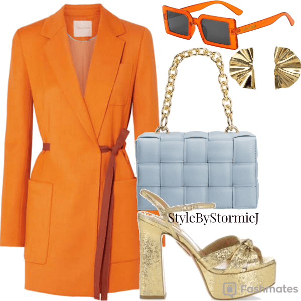 Blazer dresses are such a staple for your wardrobe. The fit and color on this one are breathtaking. The brown tie belt stands out against the orange and cinches the waist. Platforms to highlight the legs. A pair of gold earrings to match the platforms with Anya’s hardware. Berlin sunglasses in orange to match the dress and this look is complete!!
