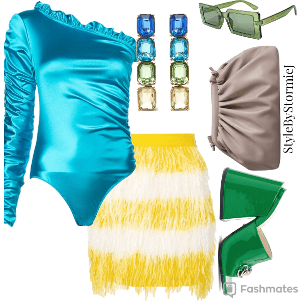 Bringing the feather trend back, I started with his vibrant feathered skirt. A shimmery metallic blue bodysuit with ruffles to shine in the night. I love the contrast of colors. These chunky green mules are definitely fun and add depth to the look. For accessories, I opted for the Chloe clutch, Berlin sunglasses, and jeweled dangle earrings to finish this fun look.