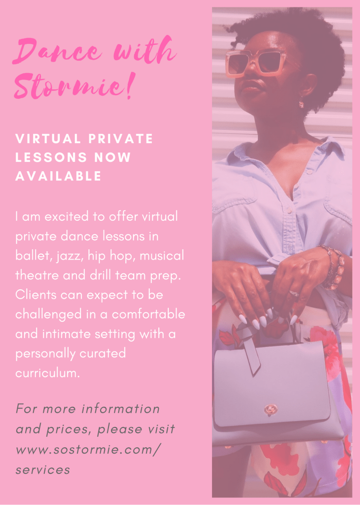I am so excited to offer virtual dance services that can be experienced from the comfort of one’s home or dance studio. These private lessons are available on a weekly basis for four (4) consecutive weeks at a time. Payment must be received within seven (7) days of the scheduled service/class. The client has the option to pay per lesson or can pay for the entire month. We recommend paying for the month upfront to secure your spot. Scheduled class time is not confirmed until payment is received. Payment isn’t due until the appointment is set following consultation. Click the button above to fill out the contact form and include what service you’re interested in booking. *NOTE – $15 non-refundable booking fee due at time of consultation*